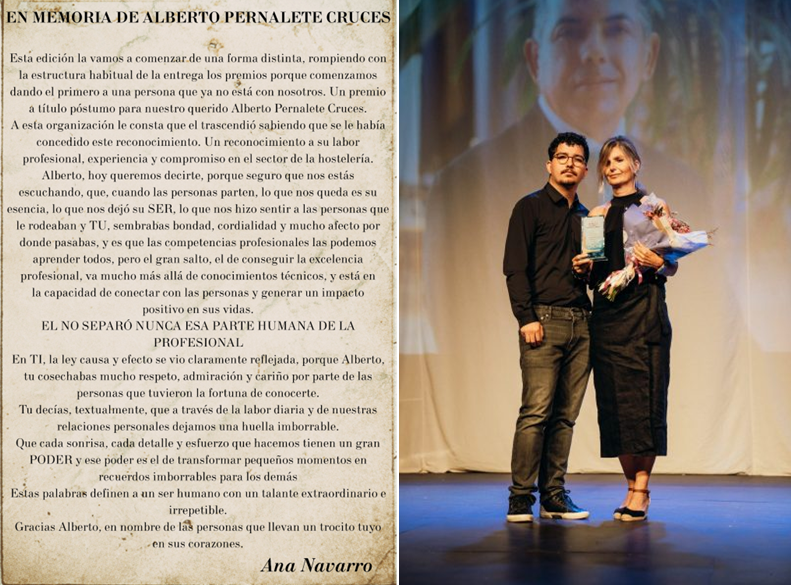 La ceremonia dio comienzo con una entrega cargada de emociones y orgullo: el homenaje póstumo a Alberto Pernalete, destacado director de Operaciones de Cordial Hotels & Resorts y ex director del Hotel Cordial Mogán Playa, quien falleció recientemente tras una larga enfermedad. Durante la ceremonia, su esposa Carina Pernalete-Fett y su hijo Leandro Noel Pernalete recibieron el premio en su nombre. Leandro, emocionado, destacó que el reconocimiento provenía de sus propios compañeros como prueba del cariño y respeto que su padre cosechó a lo largo de su carrera.